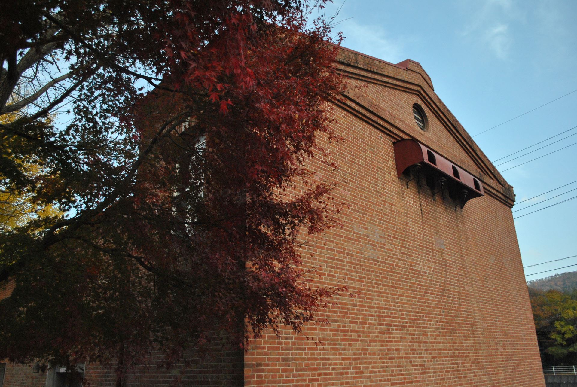 黄色に赤色に、建物。旧町屋変電所の紅葉って感じです😁。