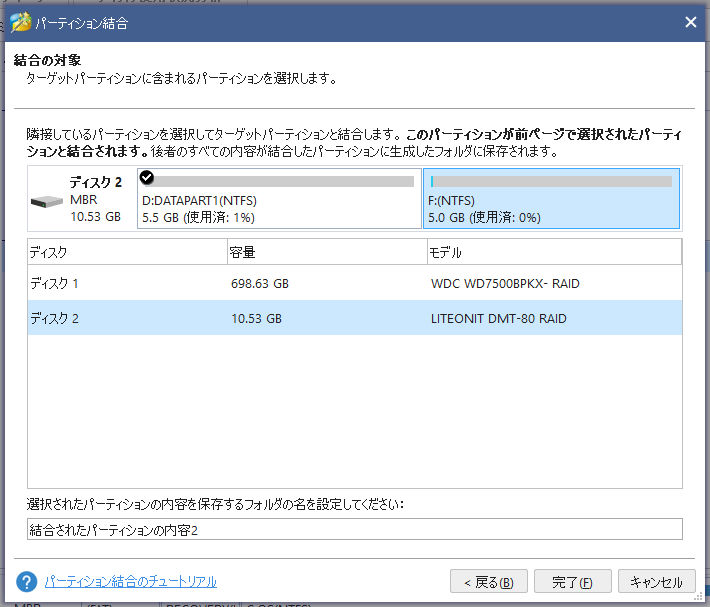 せっかくなので、結合もやってみた。元のDドライブに戻す感じで、結合を試してみる。